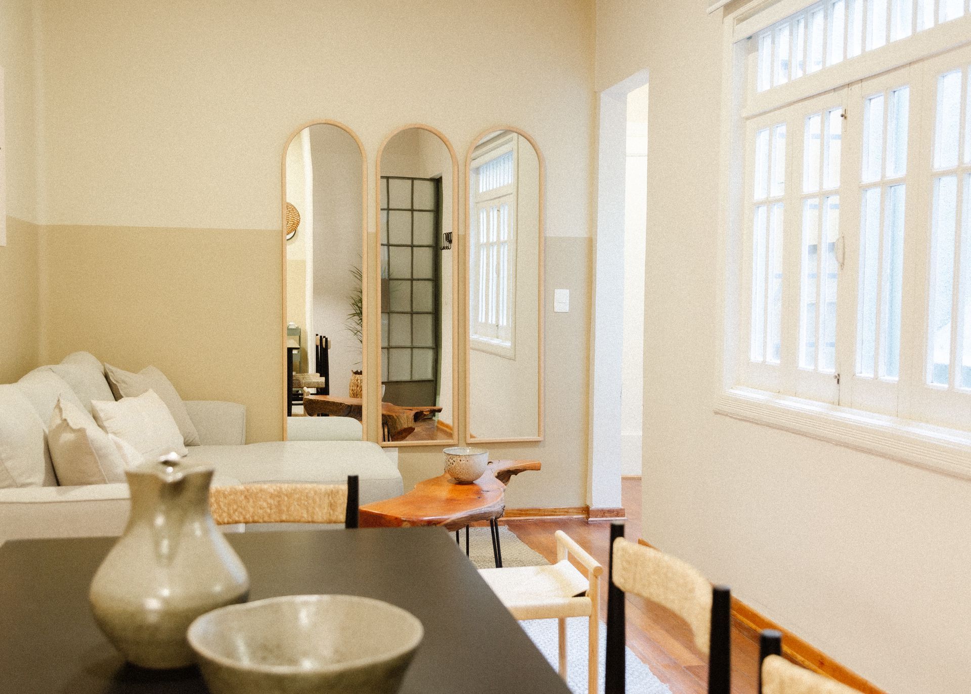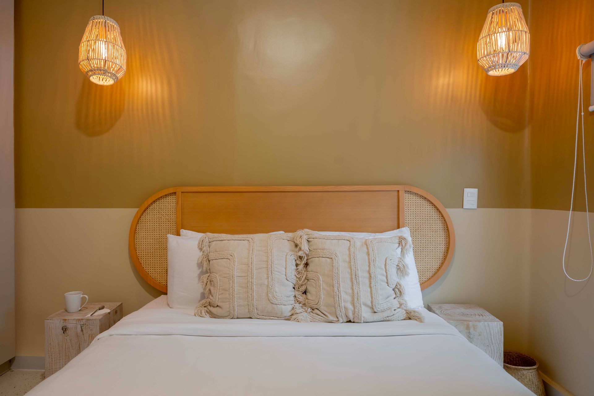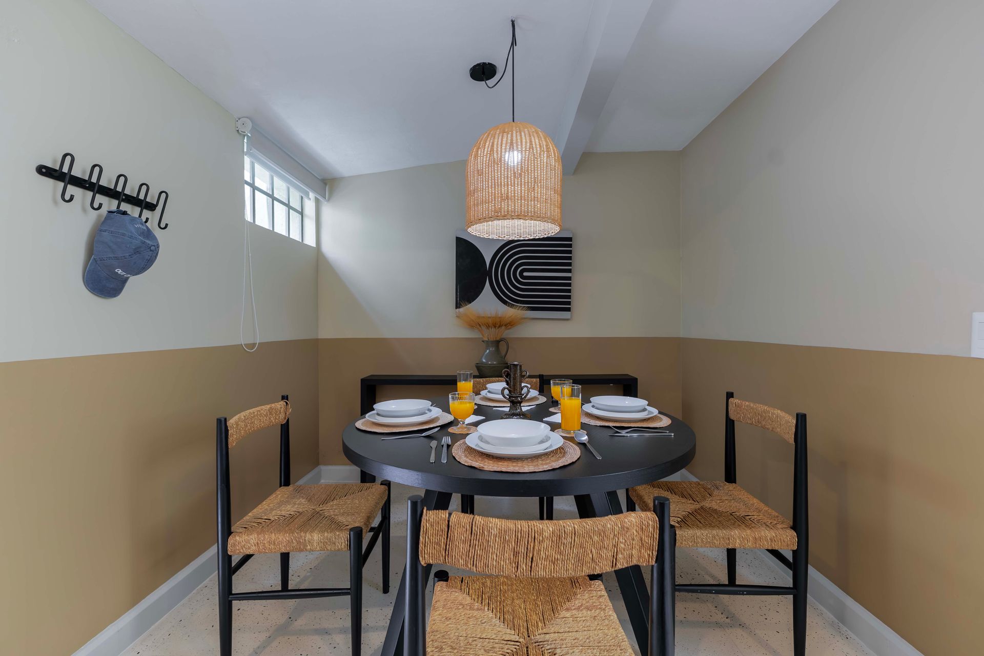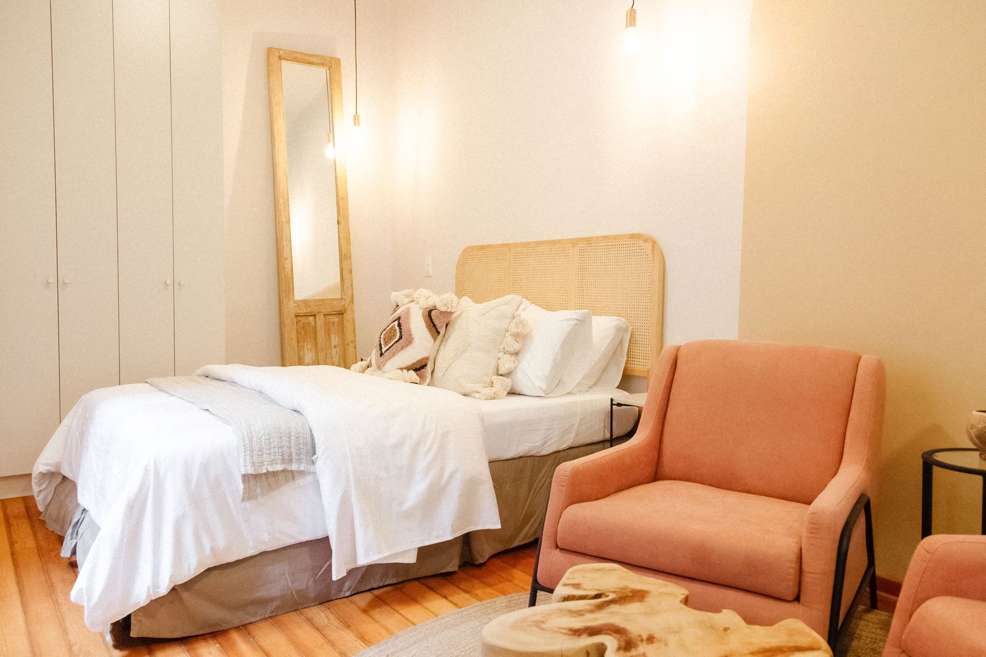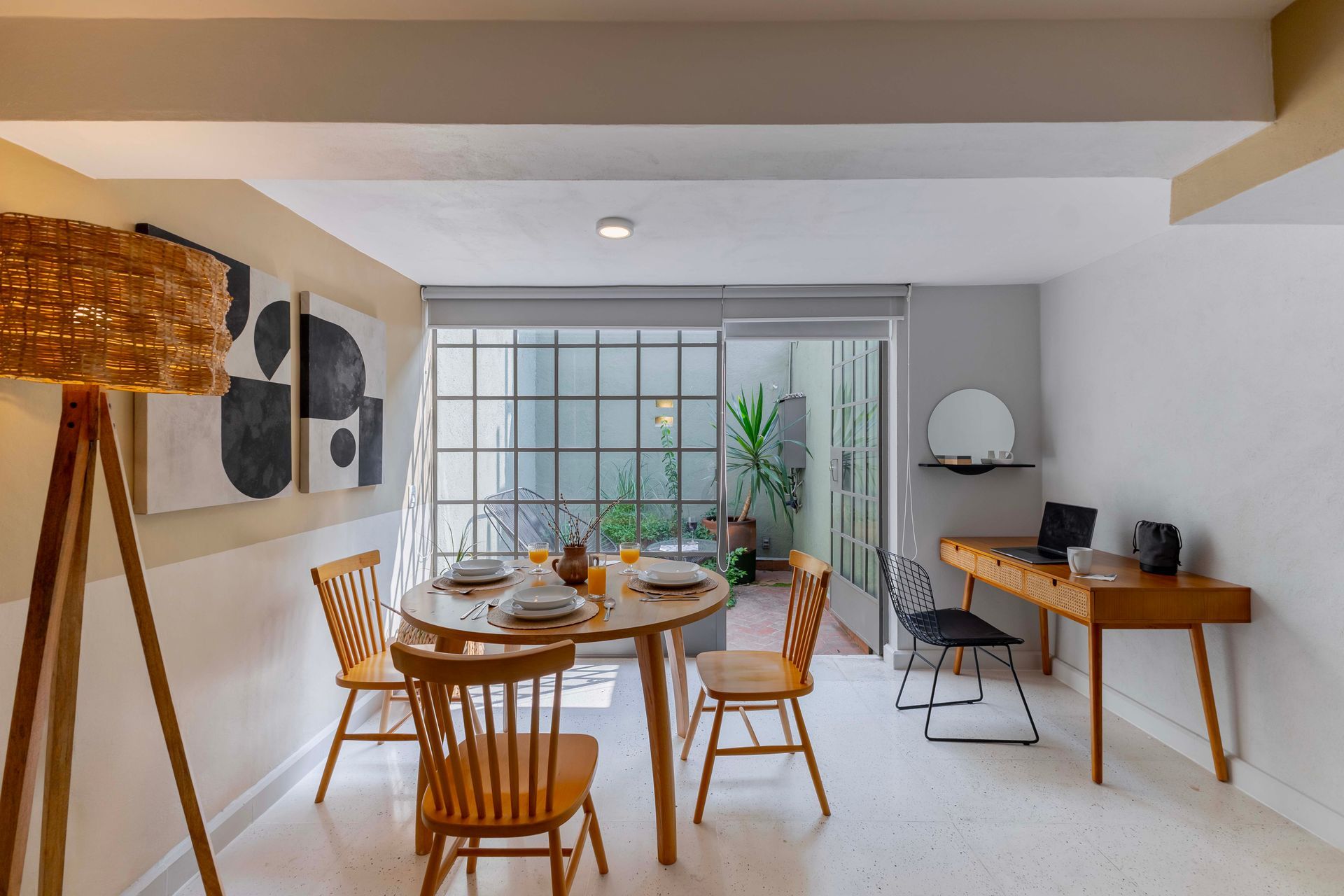 Each unit includes a small lounge area, dining space, and an equipped kitchenette, along with a separate bedroom for added privacy. The interiors stand out for their geometric lines, artisanal details, and color palette inspired by Mexican art déco, reinterpreted through a modern lens.