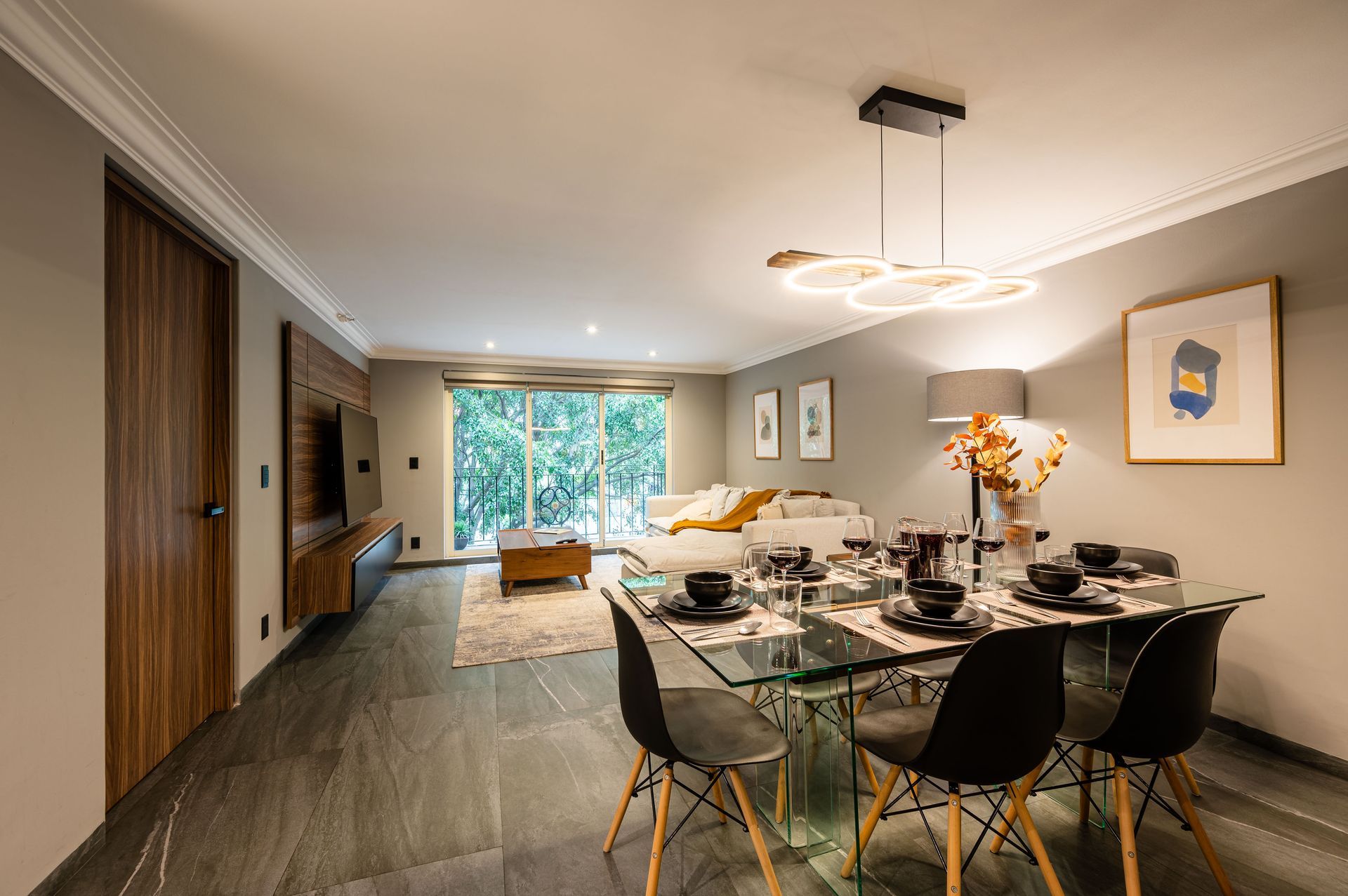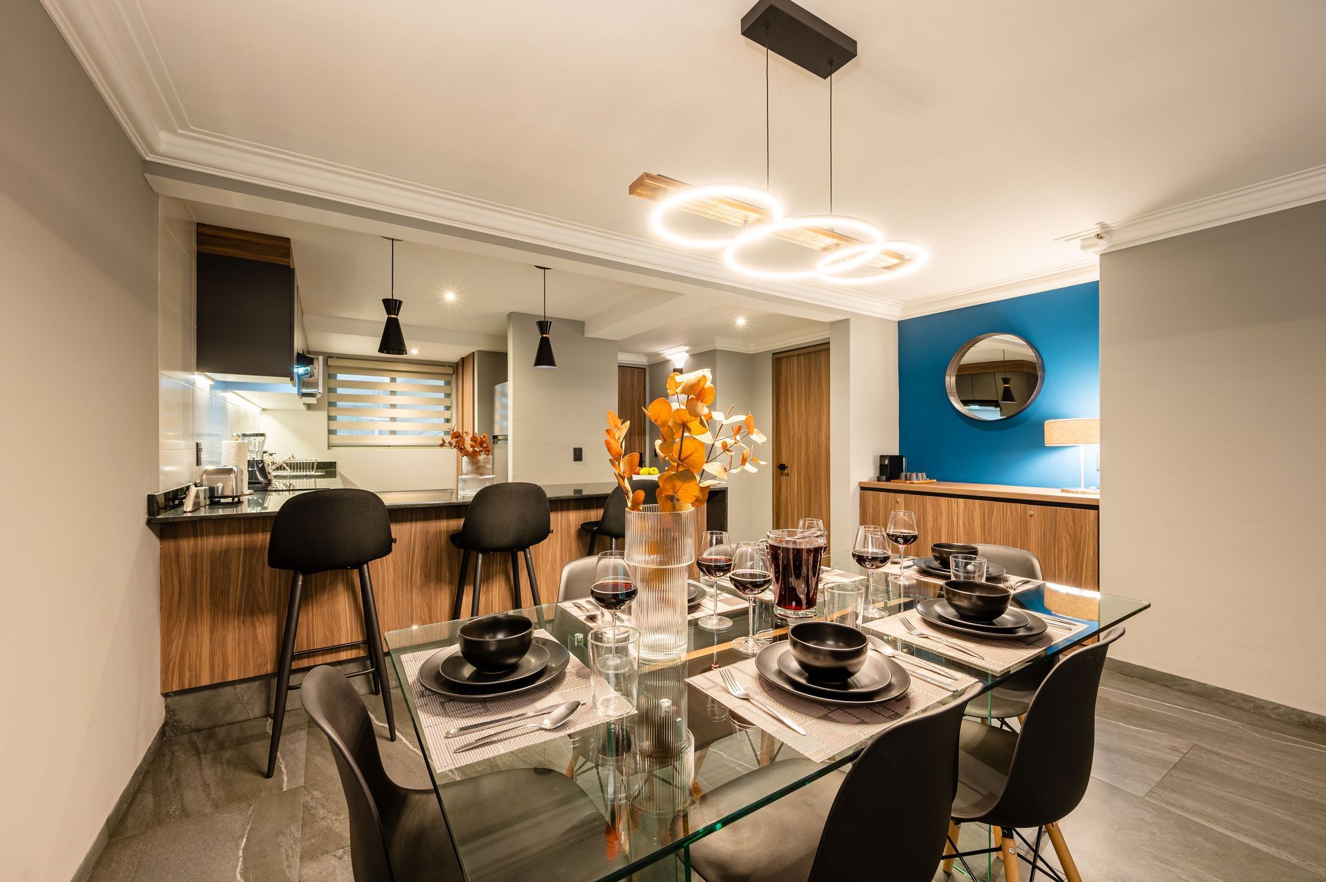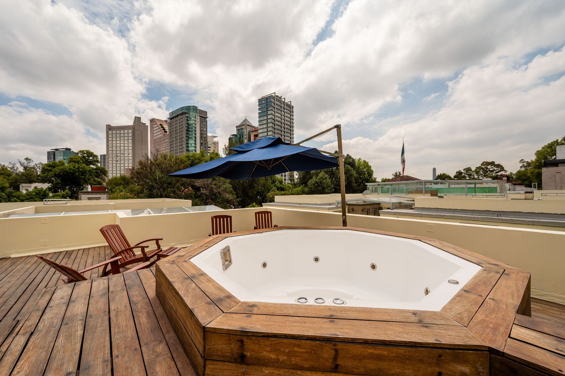 Each unit features two spacious bedrooms with private bathrooms, a fully equipped kitchen, and bright living and dining areas ideal for work or relaxation. Enjoy premium amenities including a rooftop jacuzzi, fitness center, and complimentary breakfast served daily — all within one of Mexico City’s most iconic neighborhoods.